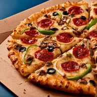 عجينة رقيقة ومقرمشة محشوة بصلصة البيتزا، وموزريلا، وبصل، وفلفل أخضر، وزيتون أسود، ومغطاة بمزيج الثوم، تُقدم مع صوص جانبي من اختيارك