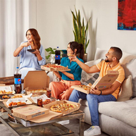 3 بيتزا وسط، بطاطس ودجز، أصابع الخبز بالجبنة، 8 قطع أجنحة دجاج، و 2.28 لتر مشروب غازي