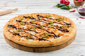 تكس مكس صلصة البيتزا، وموزاريلا، وبصل، وفلفل أخضر، وزيتون أسود، وصدور دجاج مشوية، وهلابينو، وأوريجانو