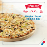 عجينة رقيقة ومقرمشة محشوة بصلصة البيتزا، وموزريلا، وبصل، وفلفل أخضر، وزيتون أسود، ومغطاة بمزيج الثوم، تُقدم مع صوص جانبي من اختيارك