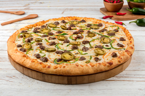 صلصة البيتزا، وموزاريلا، وبصل، وفلفل أخضر، وهلابينو، ولحم بقري