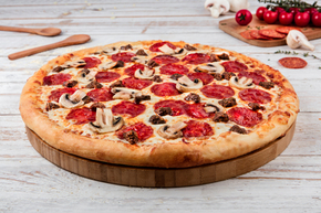 صلصة البيتزا، وموزاريلا، وبيبروني بقري، وفطر، وسجق إيطالي