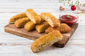 قطع من العجينة السميكة مخبوزة، مغطاة بمزيج الثوم، تُقدم مع صوص المارينارا