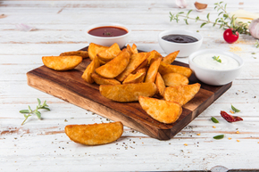 شرائح البطاطس المشوية من الفرن غنية بالتوابل تقدم مع صلصة رانش او صلصة حارة او صلصة باربكيو